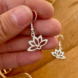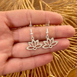 Boucles d’oreilles pendantes fleur de lotus en acier inoxydable. Légères, élégantes et hypoallergéniques – symbole de sérénité et de pureté.