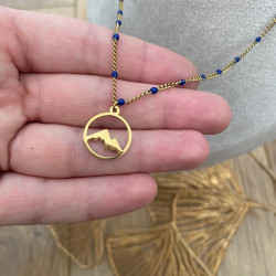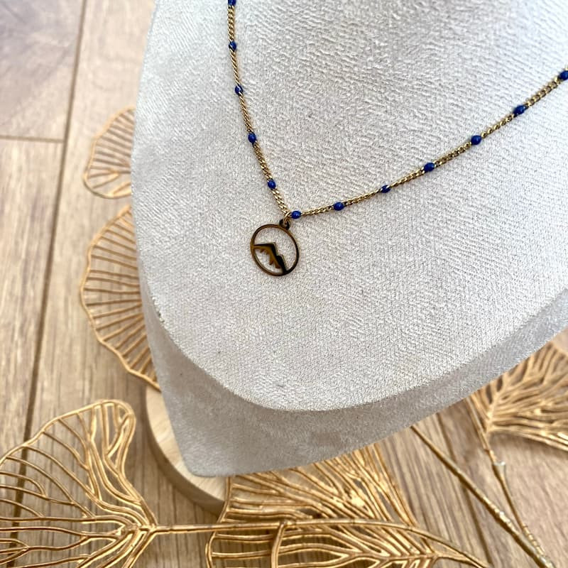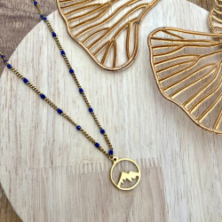 Collier montagne en acier inoxydable doré avec perles bleues, résistant à l’eau et assemblé à la main. Bijou fin et symbolique.