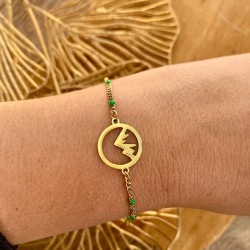 Découvrez le bracelet MONTAGNE avec sa chaine fine en acier inoxydable doré et ses perles vertes et son joli connecteur en forme de montagne. Un bracelet chic à adopter !