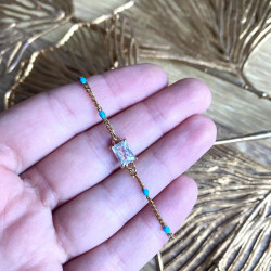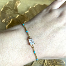 Apportez une touche de lumière et de couleur à votre poignet avec ce bracelet délicat en acier inoxydable doré, orné d’une pierre en verre et de petites perles turquoise.