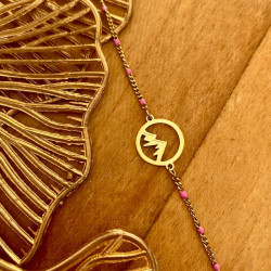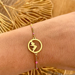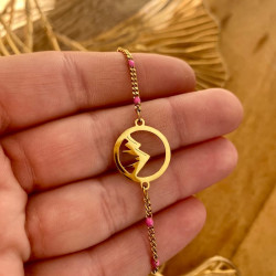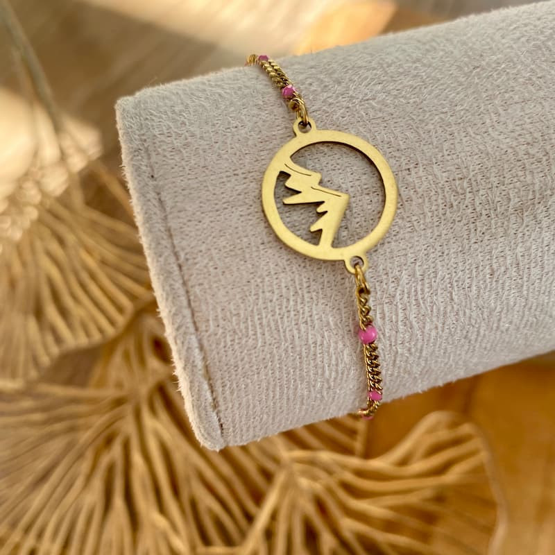Découvrez le bracelet MONTAGNE avec sa chaine fine en acier inoxydable doré et ses perles roses et son joli connecteur en forme de montagne. Un bracelet chic à adopter !