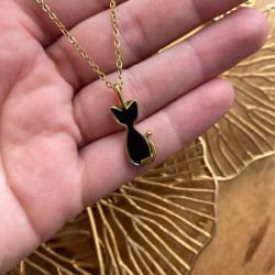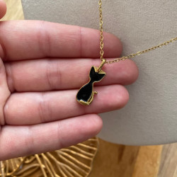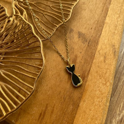 Collier chat en acier inoxydable doré avec pendentif noir. Élégant, hypoallergénique et résistant à l’eau. Idéal à offrir ou à porter au quotidien.